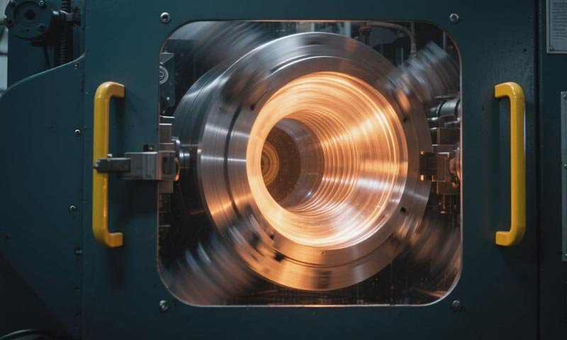 The mold is rotated at high speed while molten metal is poured into it; the force pushes the metal against the mold wall, creating a dense, uniform casting.